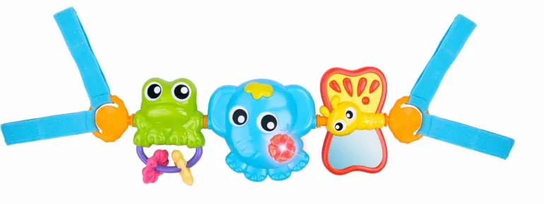 Sommerfuglen har indbygget spejl der fanger lysets refleksioner eller babys eget spejlbillede, mens de flotte farver og mønstre fremmer barnets synssans. Elefanten kan lyse og spille musik, der er med til at stimulere barnets høresans. De forskellige figurer kan dreje rundt, og opfordre derfor til leg og udvikling af motoriske færdigheder. Monteres nemt med velcro-stropper.