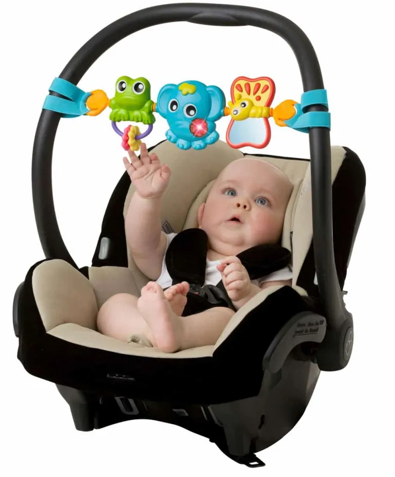 Aktivitetsleg til autostol med spejl og sjove figurer, underholder barnet under transport. Aktivitetsleg til autostol er nem at montere med velcro stropper.