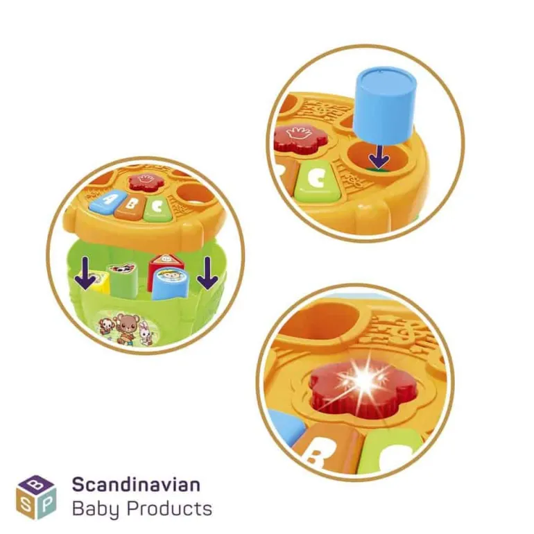 Puttekasse fra Scandinavian Baby Products. Lær barnet om former og farver med put-i-hul musiktrommen. Alle klodser har flotte farver og forskellige former. Barnet kan trykke på hænderne på trommen, hvorefter der lyder en sjov klapsalve.