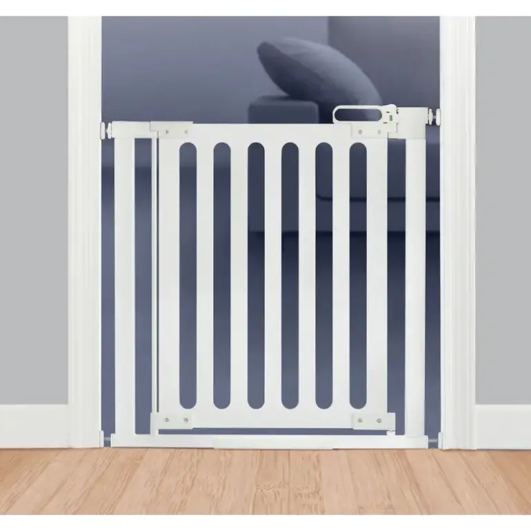 Presmonteret sikkerhedsgitter for børn.Dette sikkerhedsgitter er anvendeligt i alle stærke og ubeskadigede åbninger, dog ikke på toppen af trapper.Gitteret er meget velegnet til døråbninger og passager, der bruges hyppigt.Indbygget indikator til kontrol af korrekt montering og optimal funktion i den daglige anvendelse.Mulighed for at blokere åbning den ene vej.Indbygget tryk-og-løft-funktion for nem betjening. Svært for børn, men enkelt for voksne.Ekstra nattesikkerhed med selvlysende bundvange.