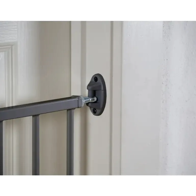 Skruemonteret sikkerhedsgitter for børn.Dette sikkerhedsgitter er anvendeligt i alle stærke og ubeskadigede åbninger.Er perfekt til at anvende på toppen af trapper. Ingen risiko for at snuble over gitteret.Gitteret kan åbnes i begge retninger.Mulighed for at blokere den ene vej for at undgå åbning over f.eks. trapper.Dobbeltbetjent låsesystem.