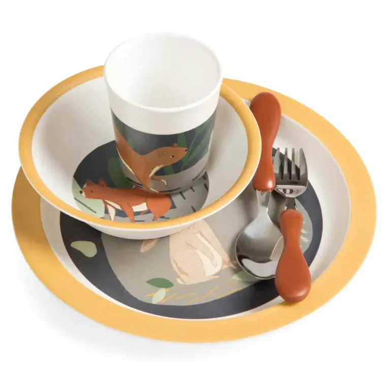 På den flade tallerken er der en illustration af haren Moonlight i sin hule under skovbunden og i bunden af den dybe tallerken finder barnet egernet Star på vej i trætoppene i nattemørket. På koppen er bjørnen Woody på vej gennem skoven midt om natten. Bestikket er designet med hensyntagen til små munde og hænder. Det ligger godt i barnets hånd, hvilket gør det lettere for barnet at lære teknikken. Børnebestikket er fremstillet i rustfrit stål med greb af plast.