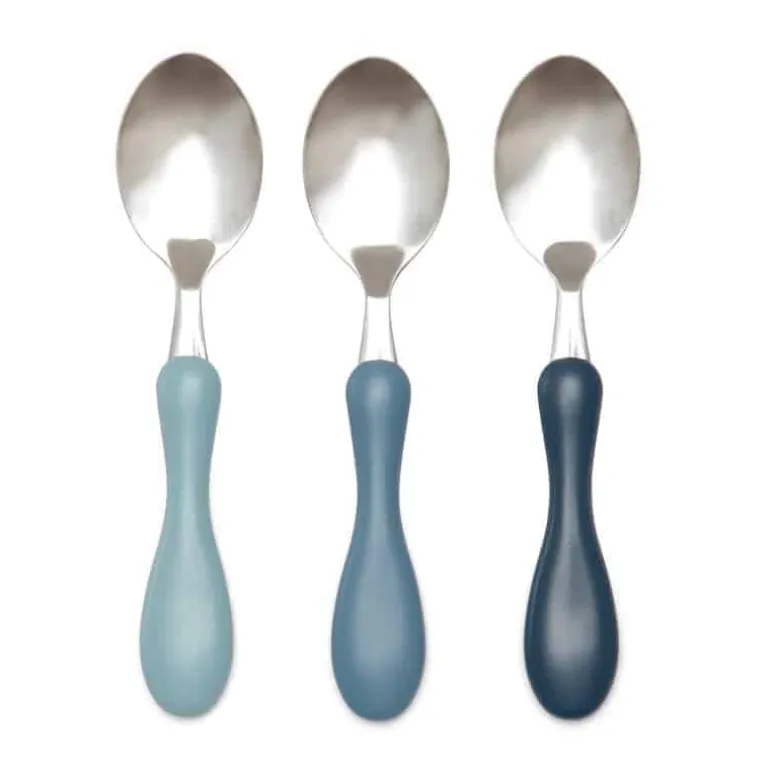 Praktisk gaveæske med tre skeer i hver deres farve velegnet til barnet, der skal lære at spise selv. Her i farvemixet “powder blue”.
