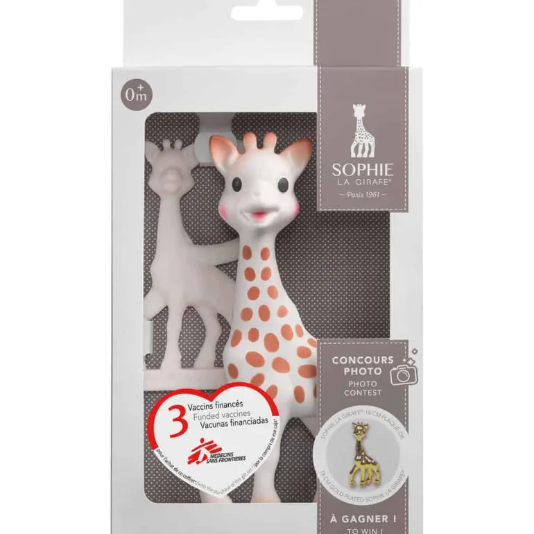 Sophie Giraf Limited Edition Æske. Fin Limited Edition pakke, der indeholder den kendte Sophie Giraf og Sophie Giraf Bidering. Bideringen på billedet er lime-farvet, men den der er i pakken er vanilla/hvid.