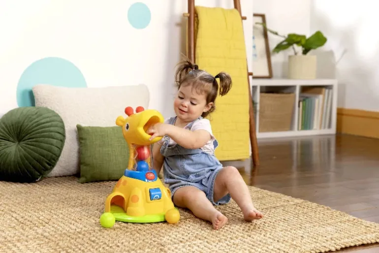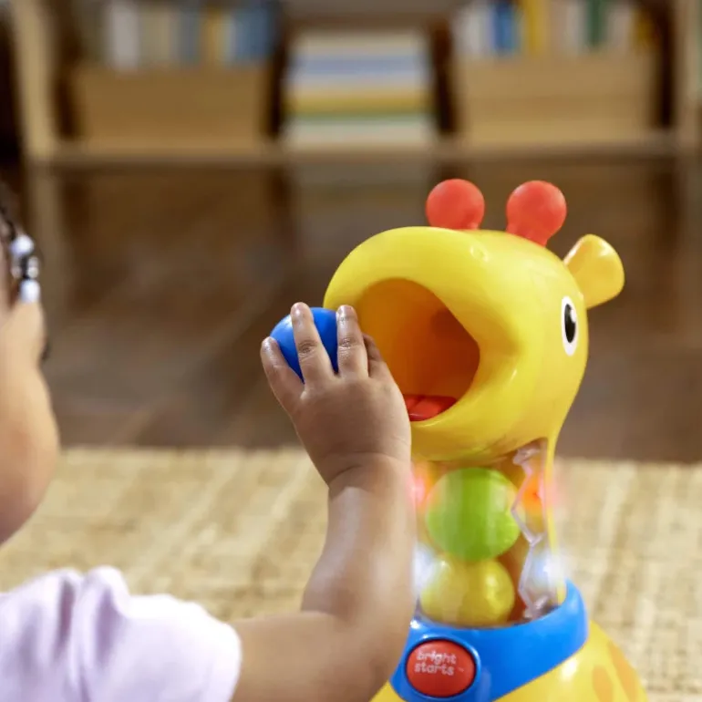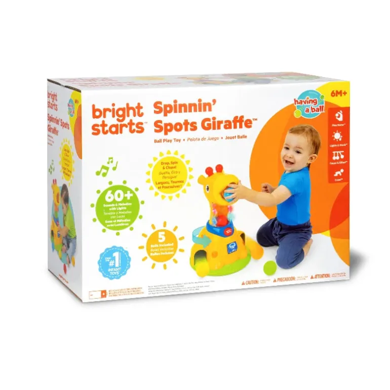 Bright Starts har givet grin og sjov et helt nyt twist med Spinnin Spots Giraffe! Denne uimodståelige giraff vil holde dit lille barn engageret og i bevægelse. Sidde-babyer kan droppe bolde i giraffens mund for musik og lys. Når din baby trykker på knappen eller slår til rullen, begynder de 60+ sjove lyde og melodier at få latteren i gang. Tryk på giraffens horn for at få ham til at spinne rundt og rundt! Bolde, der placeres i giraffens mund, vil rulle ud ved fødderne, hvilket opmuntrer til udvikling af babyens grovmotorik og leg med årsag og virkning. 5 farverige bolde medfølger. Gør dig klar til at nyde den bedste lyd i hele verden… dit lille barns latter! Tilføj denne boldspilslegetøj til din samling af babylegetøj og småbørnslegetøj, anbefalet til børn fra 6 måneder og opefter. 4 AA-batterier kræves, medfølger ikke.