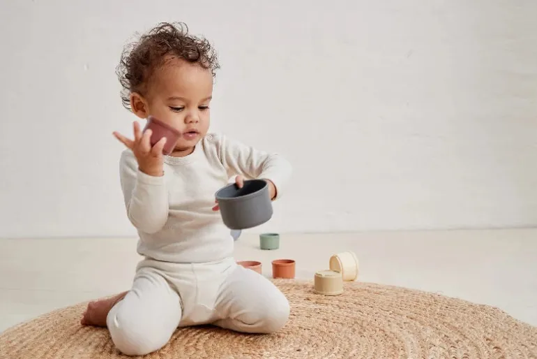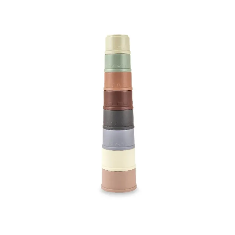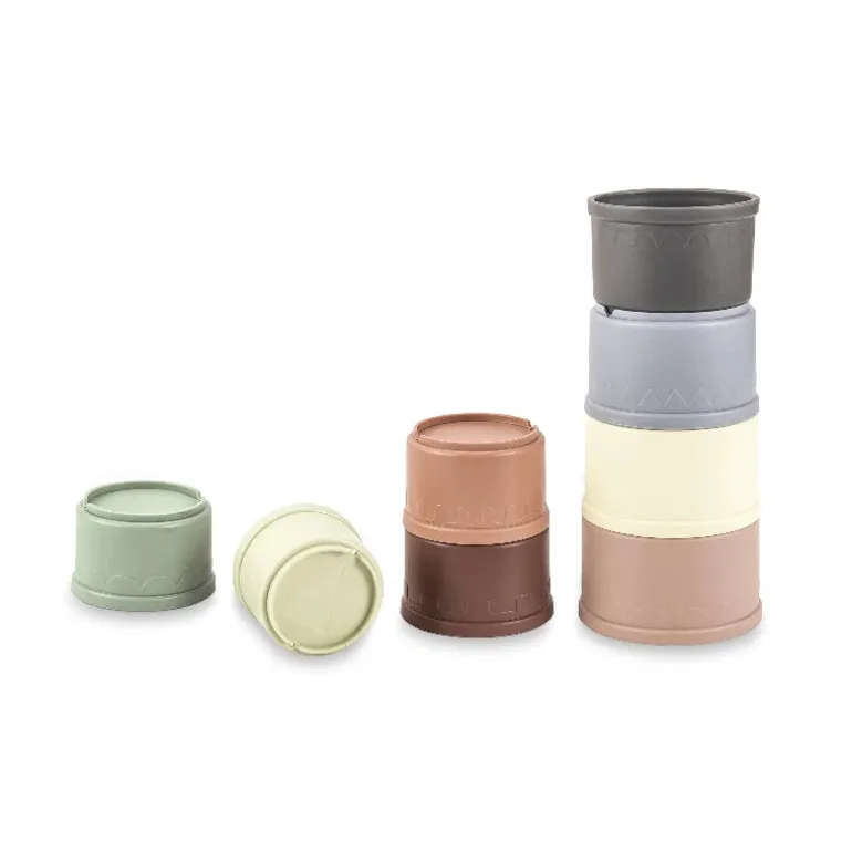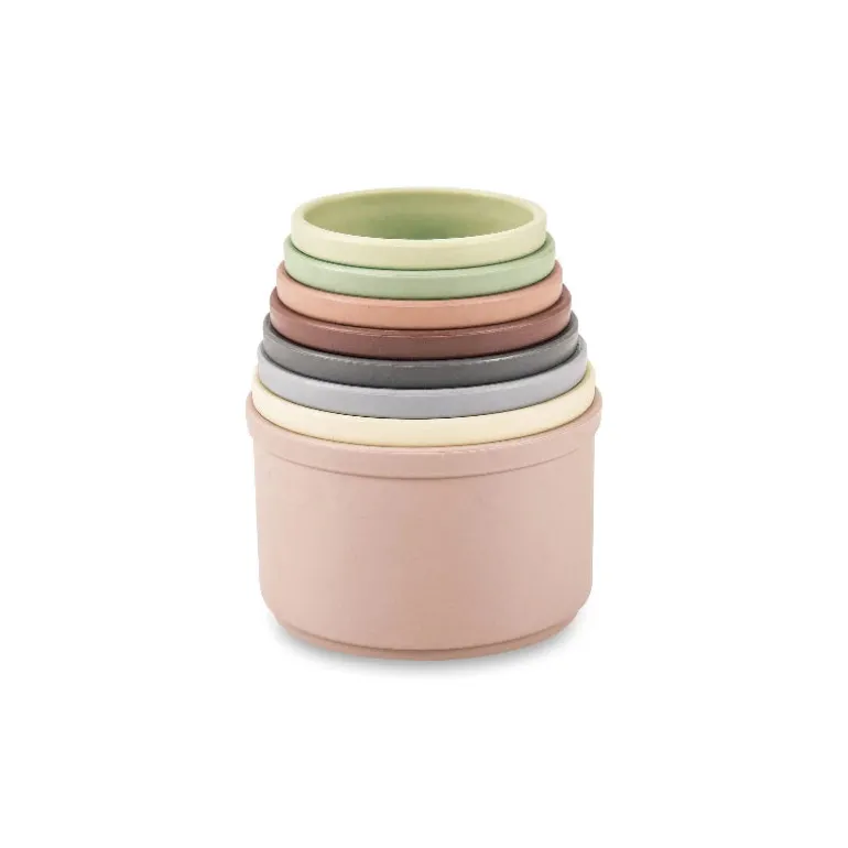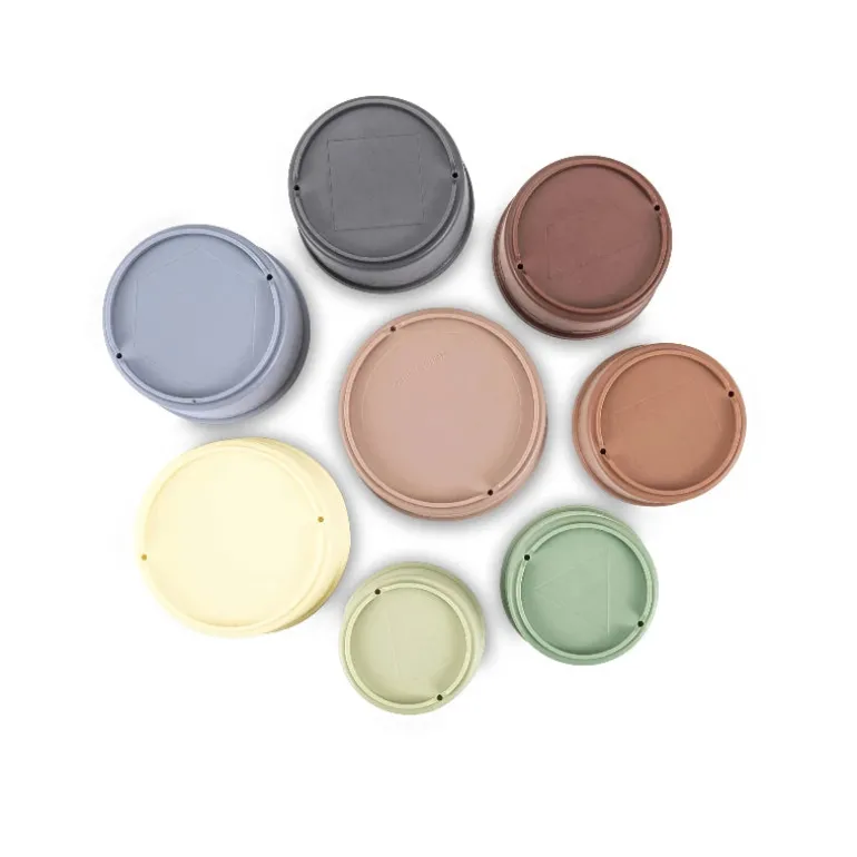 Sjove stablespande fra Scandinavian Baby Products. Sættet består af 8 spande i flotte farver. I bunden af alle spande er der udstanset huller, der gør spandene ideele til vandleg.