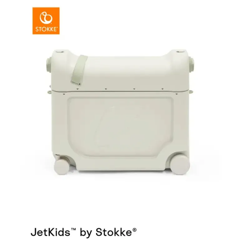 JetKids by Stokke® BedBox – Sea Green, er verdens eneste ride-on kuffert til børn, som kan bruges som en flyseng eller benstøtte.