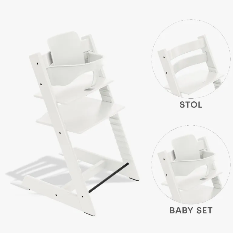 Selv den mindste i familien kan sidde med ved spisebordet med et Tripp Trapp® Baby Set², der følger med denne sampak. Det giver dit barn bevægelsesfrihed og hjælper det med at lære den vigtige færdighed at sidde. Når dit barn selv kan klatre op og ned fra stolen, kan du fjerne dit Baby Set. Det giver barnet større bevægelsesfrihed og mere selvstændighed.