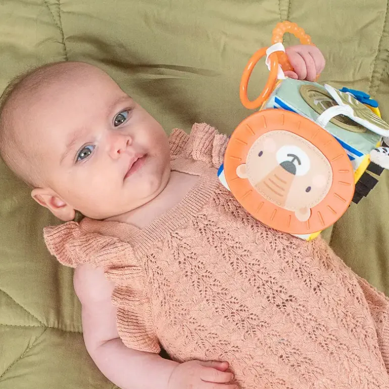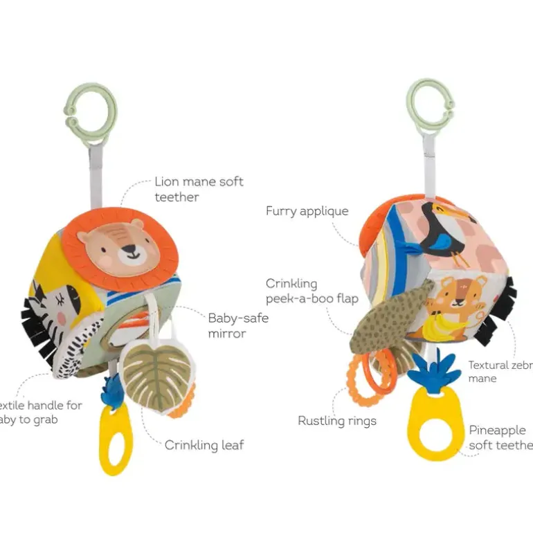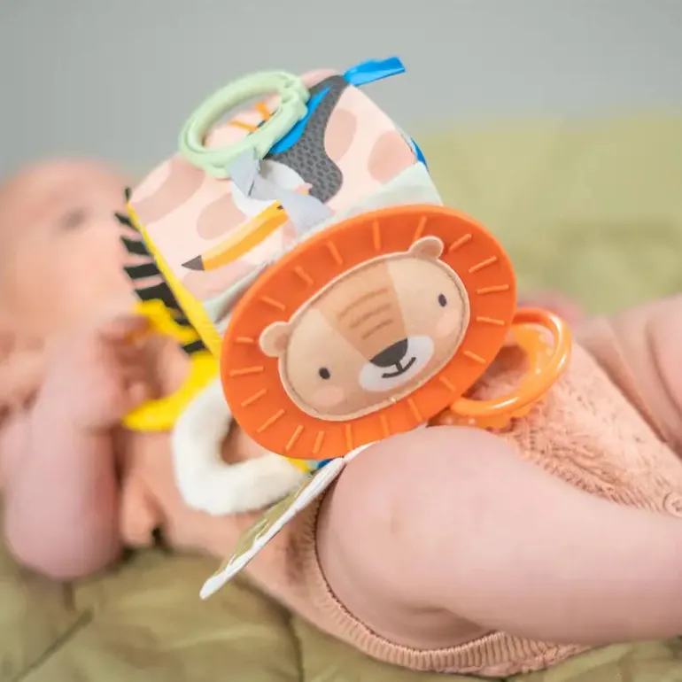 Savannah Discovery Cube er et aktivitetslegetøj fra TAF Toys med materialer, lyde og andet sjovt, der overrasker og stimulerer til leg og udvikling. Legetøjet har plastikringe, rangle, bidelegetøj, sjovt ansigt på hver side, børnesikkert spejl, lyde der spilles når man trækker i snoren og stof med forskellige mønstre og former. Der er en ekstra stor ring så det er let at sætte legetøjet på fx barnevognen, sengen eller vuggen.