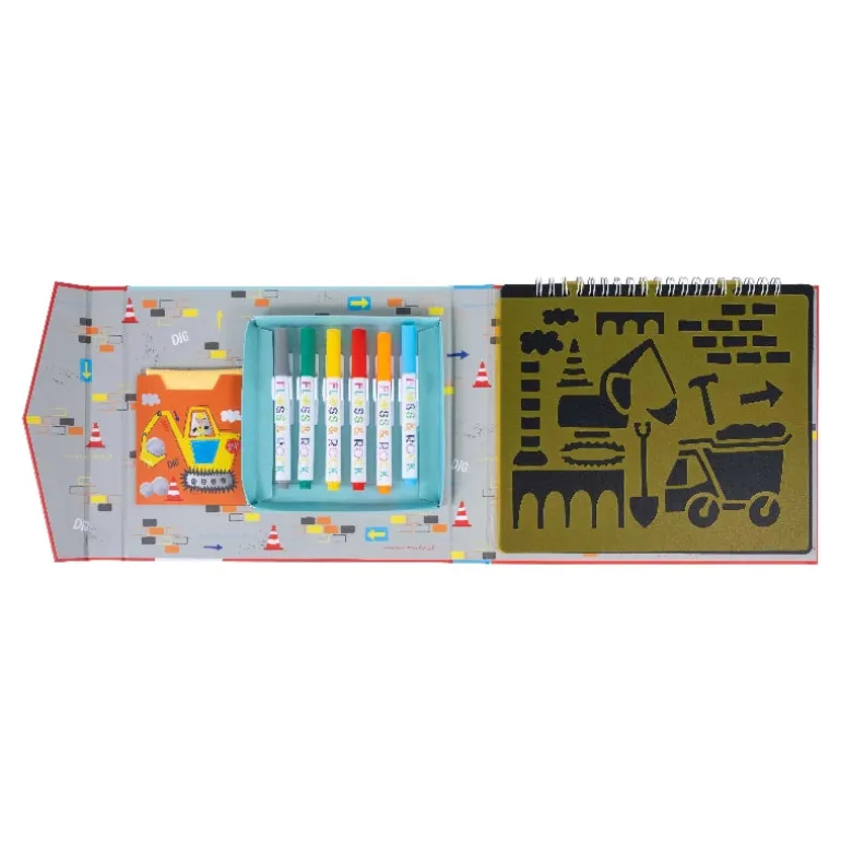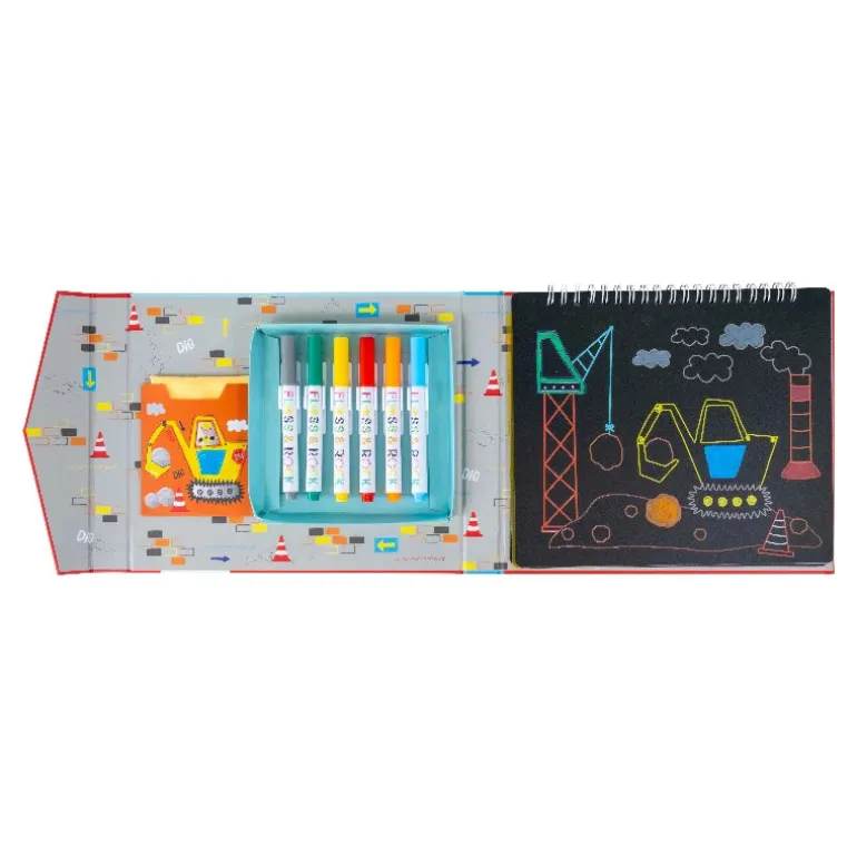En sjov kridttavle i et skitsebogsformat, der kan aftørres! Denne geniale Construction Skitsebog indeholder 8 sider. 5 sider som er klar til farvelægning, plus 3 almindelige sider klar til fri fantasi! Der er også en skabelon med construction-tema. Skitsebogen leveres med 6 forskellige kridtpenne og en praktisk rengøringsklud til at tørre siderne rene!
