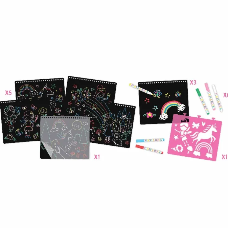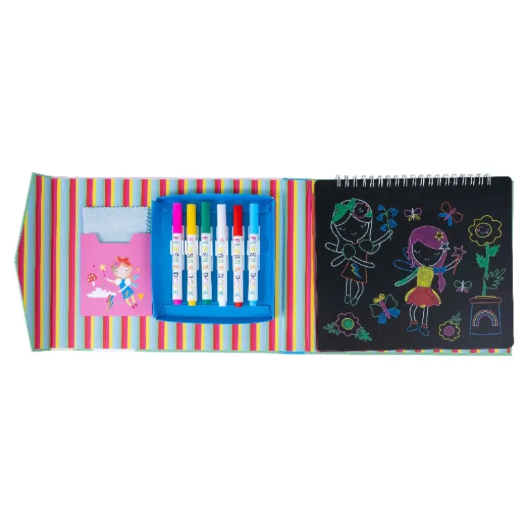 En sjov kridttavle i et skitsebogsformat, der kan aftørres! Denne geniale Regnbue Skitsebog indeholder 8 sider. 5 sider som er klar til farvelægning, plus 3 almindelige sider klar til fri fantasi! Der er også en skabelon med regnbue-tema. Skitsebogen leveres med 6 forskellige kridtpenne og en praktisk rengøringsklud til at tørre siderne rene!