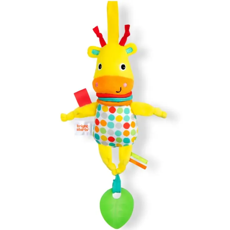 Denne smukke giraf fra Bright Starts, som kan trækkes i og leges med, vil skabe glæde hos dig og dit barn, mens I lærer og leger! Et let træk i bladet får giraffen til at strække sig. Se giraffens krop udvide og trække sig langsomt sammen i takt med 60 sekunders glade melodier. Dette musikalske legetøj fremmer udviklingen af finmotorikken, synssansen og forståelsen af princippet om årsag og virkning Dit barn vil elske de forskellige bløde materialer, der giver barnet mulighed for at udforske giraffen, samt tilbehøret i klare farver, mens du ikke vil kunne modstå de dejlige grin, som dette legetøj frembringer hos dit lille barn!